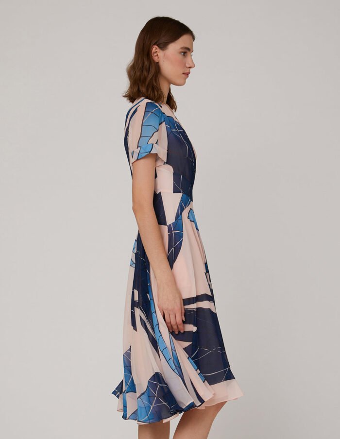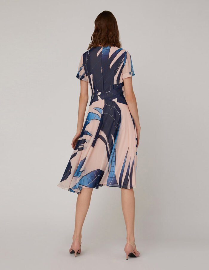 This dress brings dynamic variation with a cross-split design at the waist. A delicate V-shaped neckline and delicate pleated decoration add a touch of elegance and femininity. The large wavy skirt adds a smart and light atmosphere. Irregular art prints make people feel atmospheric and intellectual.