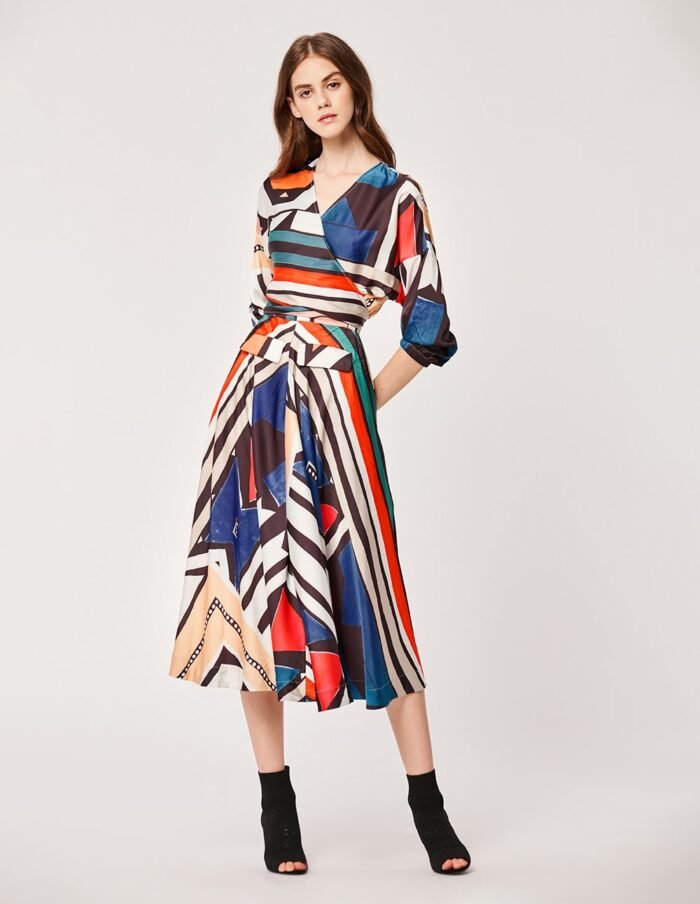 It is inspired by Ndebele national pattern. and the gorgeous colors present an exotic atmosphere.The silk fabric is draped and light. and waist-cut A-line skirt modifies the body shape. V-neck stand modifies the neckline. and off-shoulder lantern sleeves add a retro mood in spring and summer.