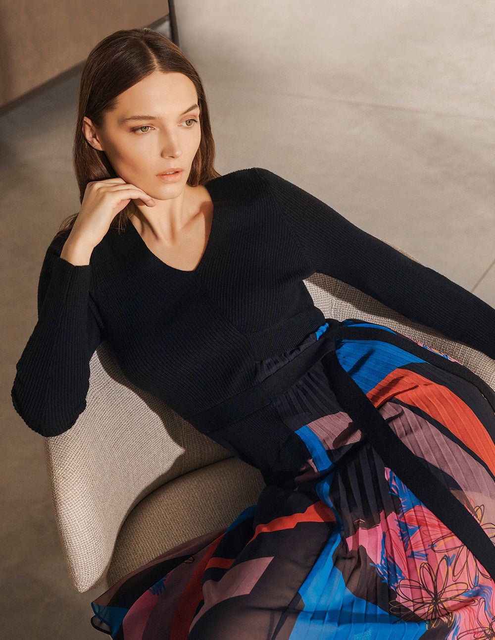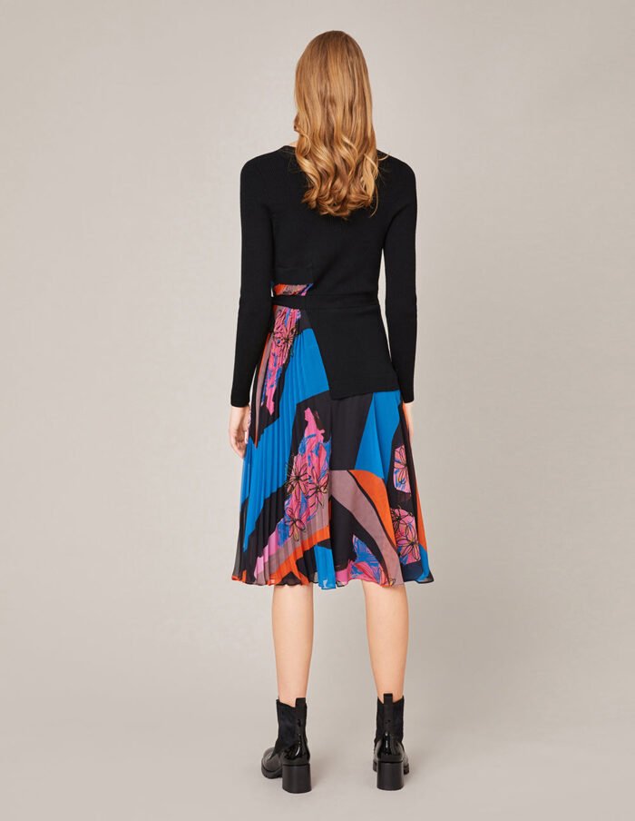 V-neck midi dress crafted from asymmetrical ribbed-knit fabric combined with an abstract flared print georgette dress. It of a kind piece for high-impact and chic dressing.